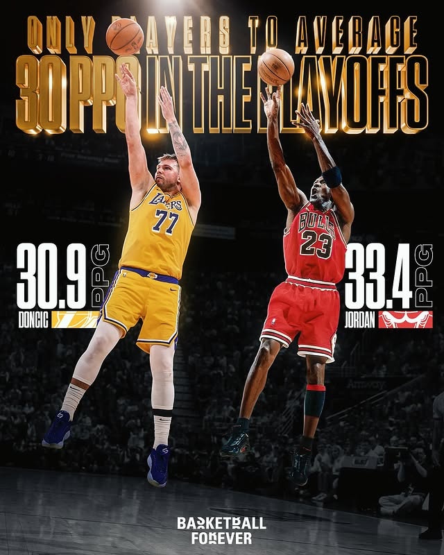 乔丹生涯179场季后赛,场均33.4分;东契奇55场季后赛,场均30.9分。